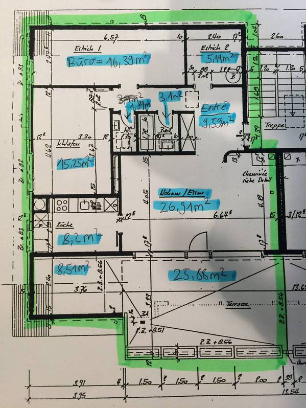 - Wohnzimmer (26.91m2), Schlafzimmer (15.25m2), Büro (16.39m2), Küche (8.51m2), Bad (3.1m2) WC (1.89m2), Diele / Entre (9.59m2), Reduit (5.99m2)